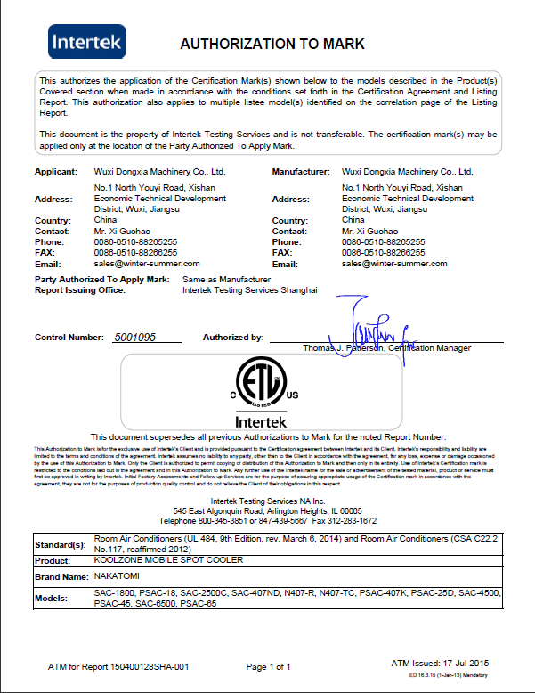 MK官方网页版-MK(中国)近日宣布公司移动式工业冷气机获得的质量与安全第三方机构天祥实验室(世界上规模的消费品测试、检验和认证公司之一)颁发的ETL认证。